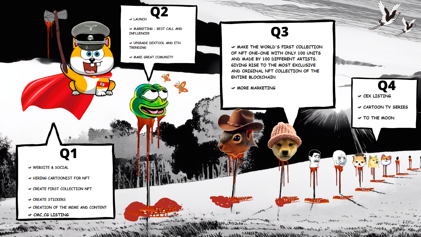 And that's when everything feels different, you know what I mean? Something's changed inside him, seemingly a mad interaction between AI tech, blockchain, and his vital energy. He starts noticing that some of the things he thinks about are actually materializing, as if he's acquired bloody superpowers. Shitler reckons it's time to get back at all those memecoins, shitcoins, and scammers who've screwed him over. He tricks 'em, outwits 'em, or finds his way to victory, earning himself the moniker Shitler the Conqueror.